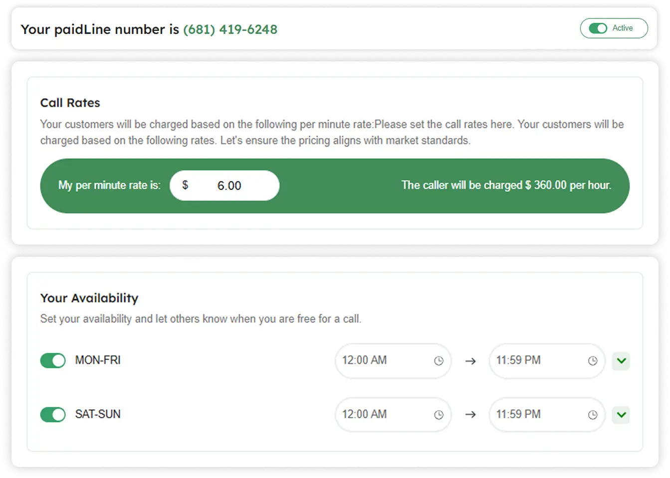 Simply set your desired rate, decide when you want to receive calls, share your Paidline number and start earn money for phone calls.