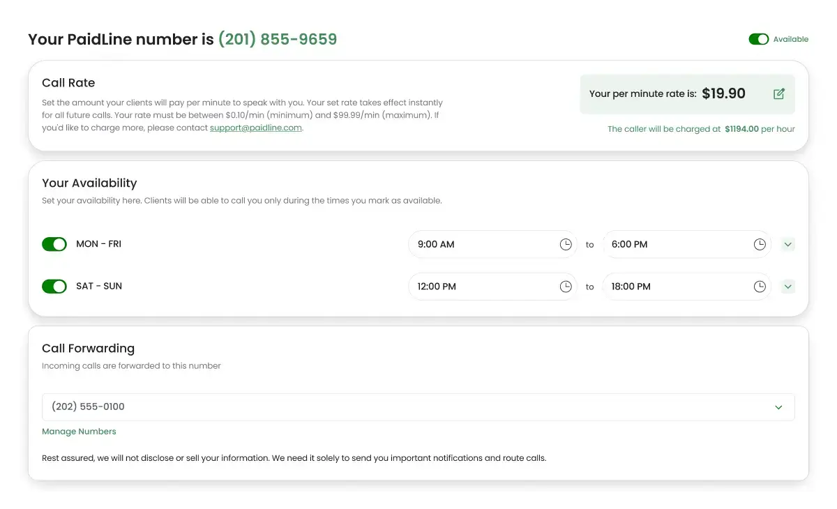 Pro Tip: Use your PaidLine dashboard to set ‘available’ hours — that way, you’ll only receive paid calls when you’re ready to talk.